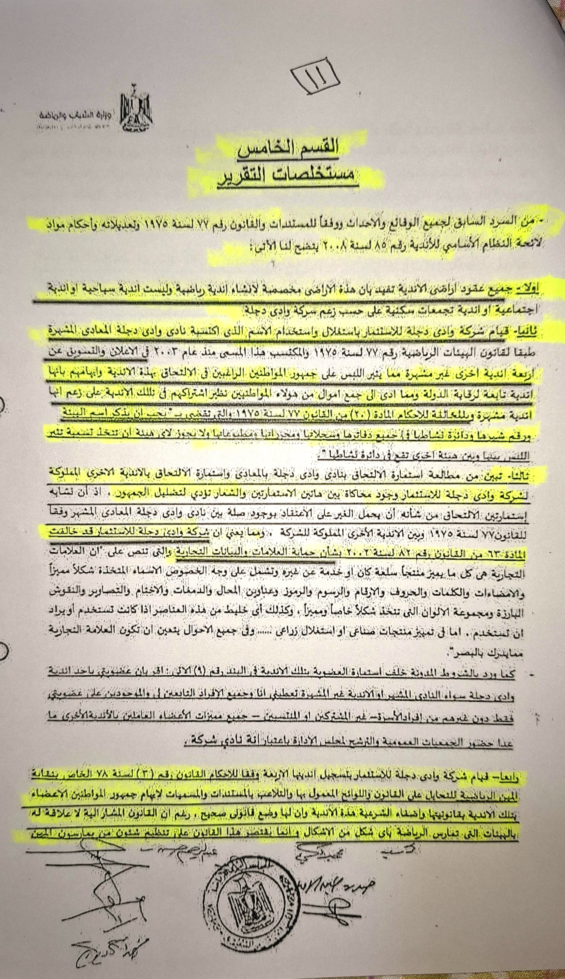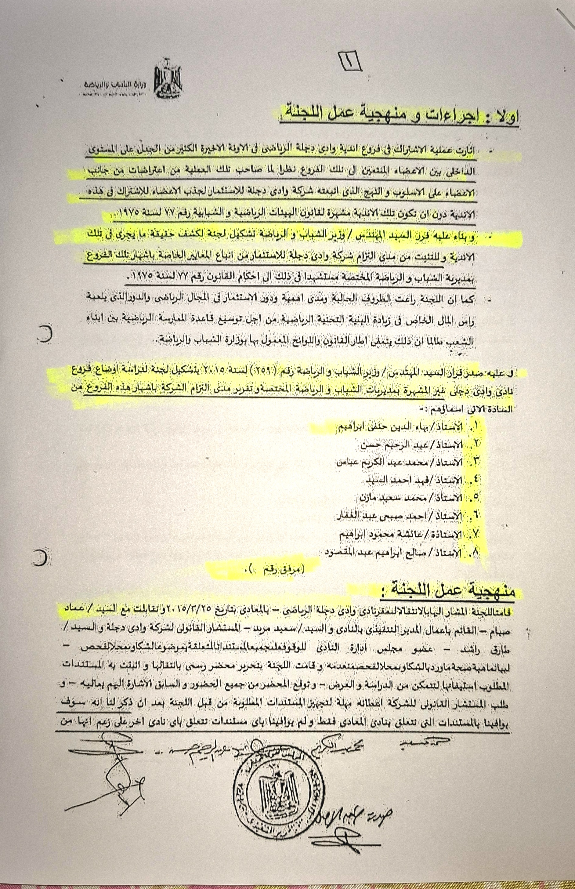 سنعرض صفحات منه باللجنه العليا التي شكلها المهندس وزير الشباب والرياضه بموجب القرار رقم 259 لسنه 2015 والذي جاء هذا القرار بتشكيل لجنه لدراسه اوضاع فروع نادي وادي دجله غير المشهره بمديريات الشباب والرياضه المختصه وتقرير مدى التزام الشركه باشهار هذه الفروع.