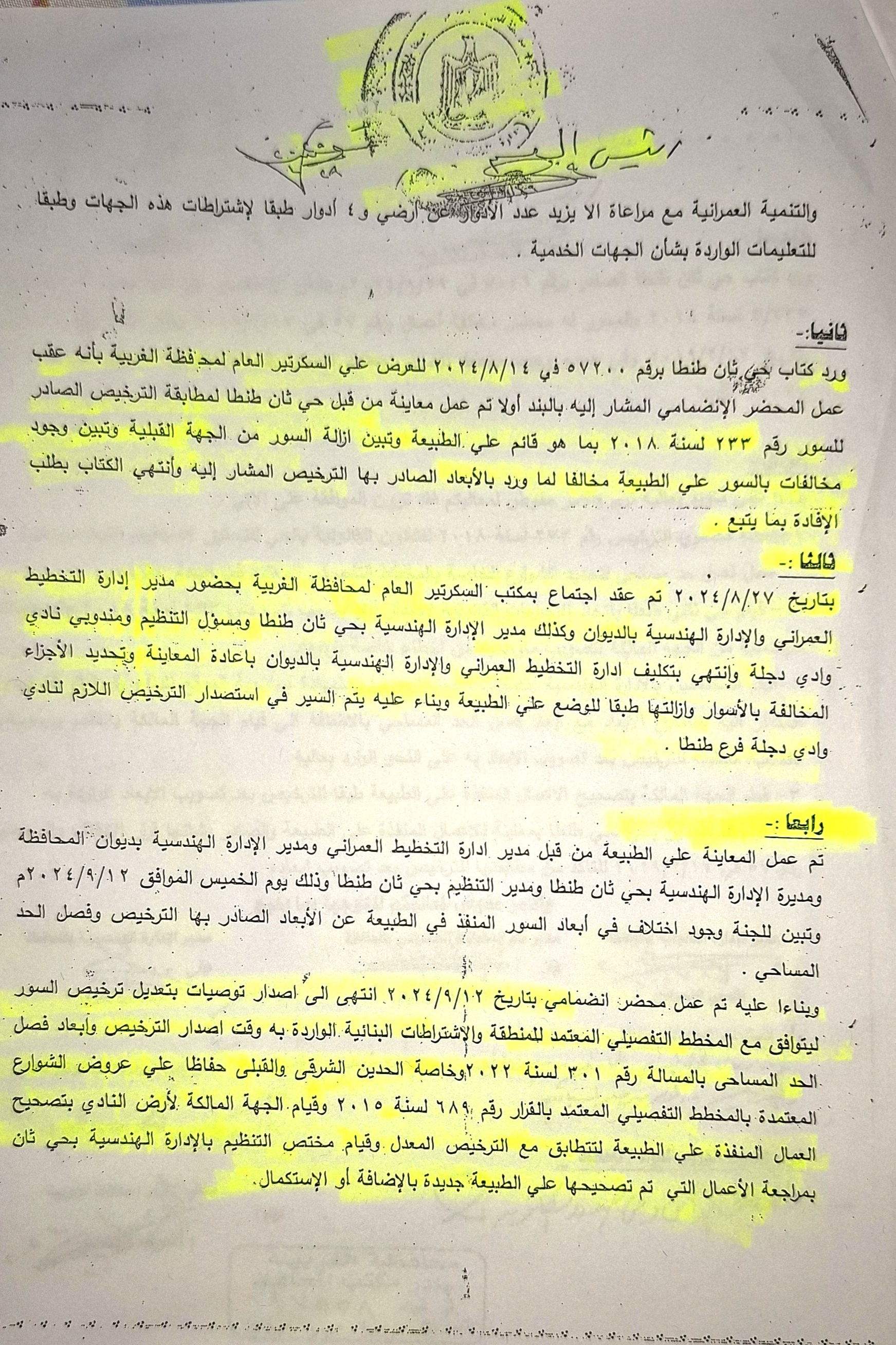 اما فيما يتعلق بالضلع القبلي في رخصه وادي دجله بطنطا فصل الحد المساحي ذكر ان طول هذا الضلع 94 متر سمحوا للنادي بالاعتداء بمقدار مترين وجعلوا هذا الضلع 96 م وقاموا بالتحشير والاضافه بعد توقيع مسؤولي الاداره الهندسيه بحي ثانى طنطا واضافوا كلام يؤدي الى العقاب ويؤدي الى المحاسبه.