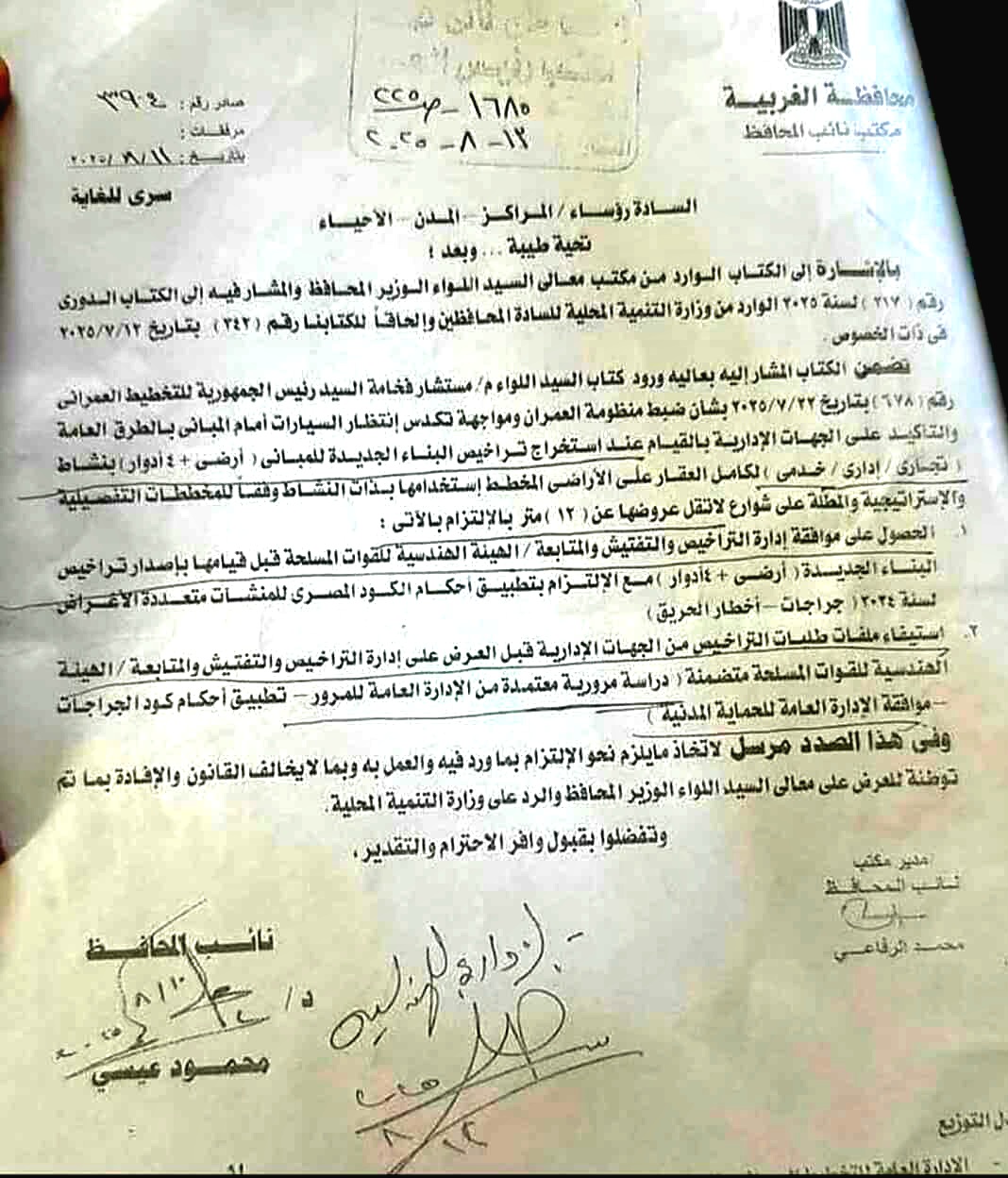 هي مخالفه كتاب السيد اللواء مهندس مستشار فخامه السيد رئيس الجمهوريه للتخطيط العمراني رقم 678 الصادر بتاريخ 22/7/2025 بشان ضبط منظومه العمران ومواجهه تكدس انتظار السيارات امام المباني بالطرق العامه والتاكيد على الجهات الاداريه بالقيام عند استخراج تراخيص البناء الجديده للمباني ارضي + اربعه ادوار بنشاط تجاري او اداري او  خدمي لكامل العقار على الاراضي المخطط استخدامها بذات النشاط وفقا للمخططات التفصيليه والاستراتيجيه والمطله على شوارع لا تقل عروضها عن 12 متر بالالتزام بالاتي::