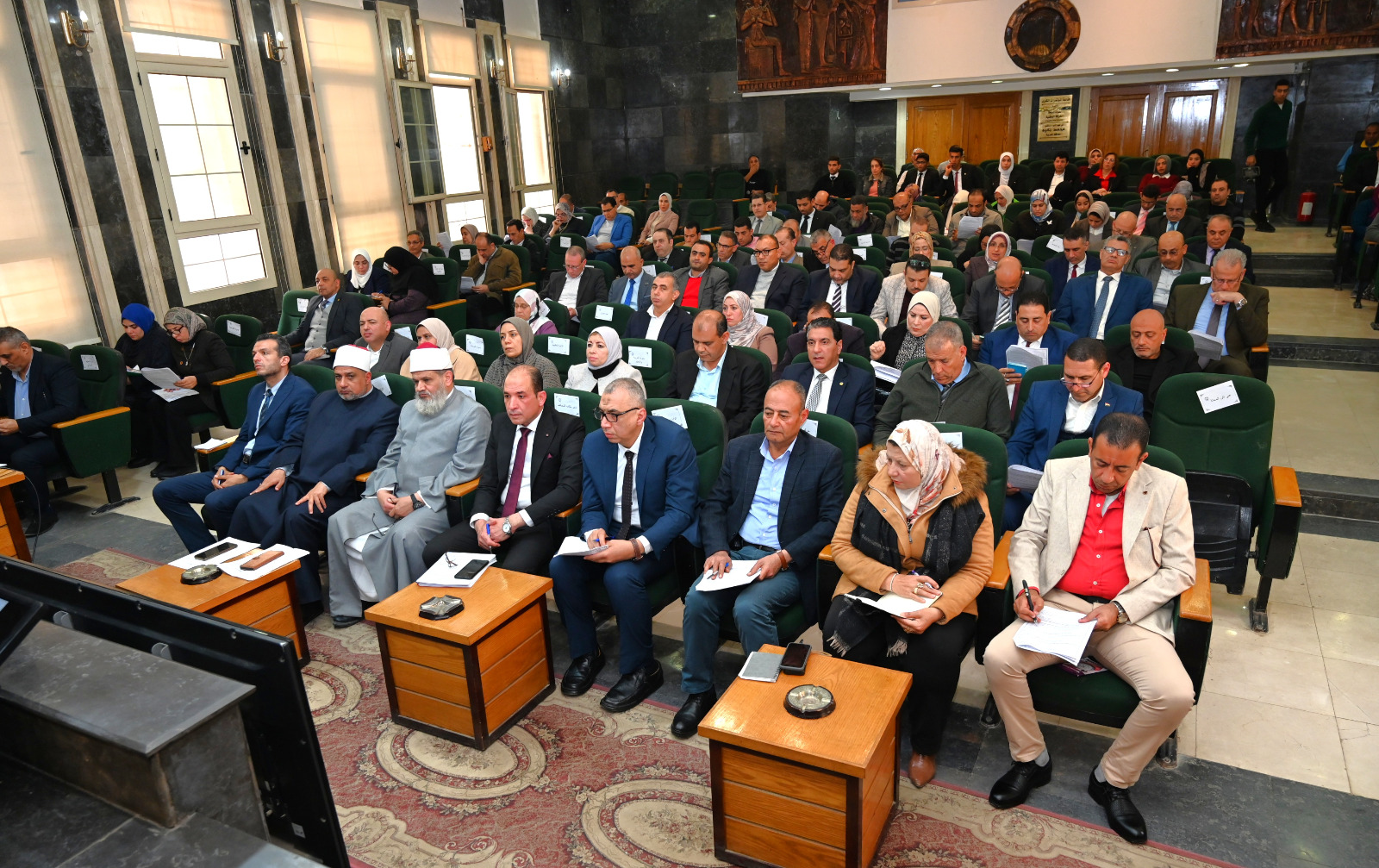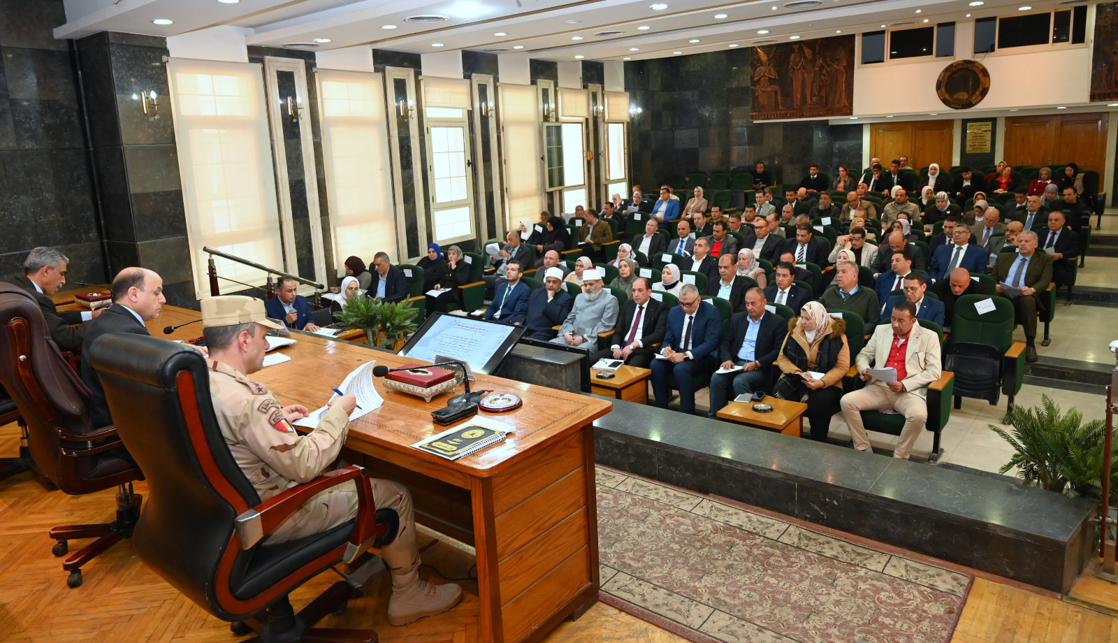 جاء ذلك بحضور العميد أركان حرب وائل فتحي المستشار العسكري للمحافظة ،الأستاذ خالد العرفي السكرتير العام المساعد، اللواء محمد عناني رئيس الادارة المركزية لشؤون مكتب المحافظ،رؤساء المراكز والمدن، ووكلاء الوزارات، ومديري المديريات والمصالح الحكومية، إلى جانب القيادات التنفيذية والامنية بالمحافظة.